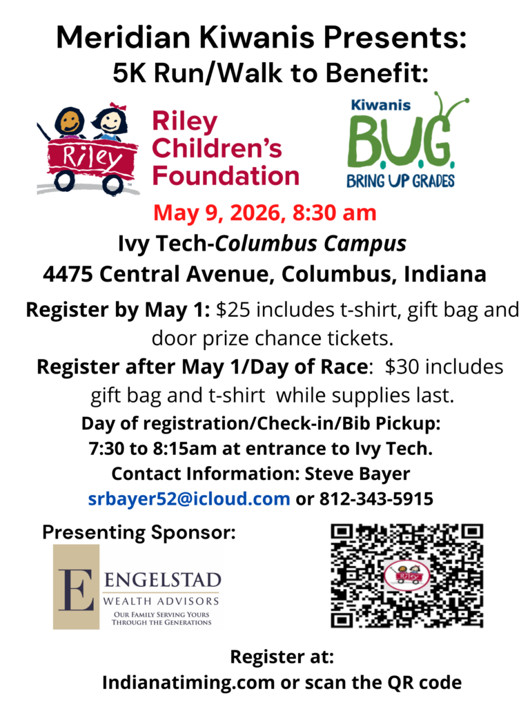 The 2026 Kiwanis 5K “Run/Walk for Kids” circles through the Ivy Tech campus and the Columbus Municipal Airport in Columbus, IN. This is the official site for our fifth annual event to support children who need special medical and related services. Proceeds will go to Riley Children’s Hospital and local Kiwanis Youth Education Programs including K-BUG and “Books for Kids”. Kiwanis has partnered with Riley to support its efforts in many ways for over 104 years.